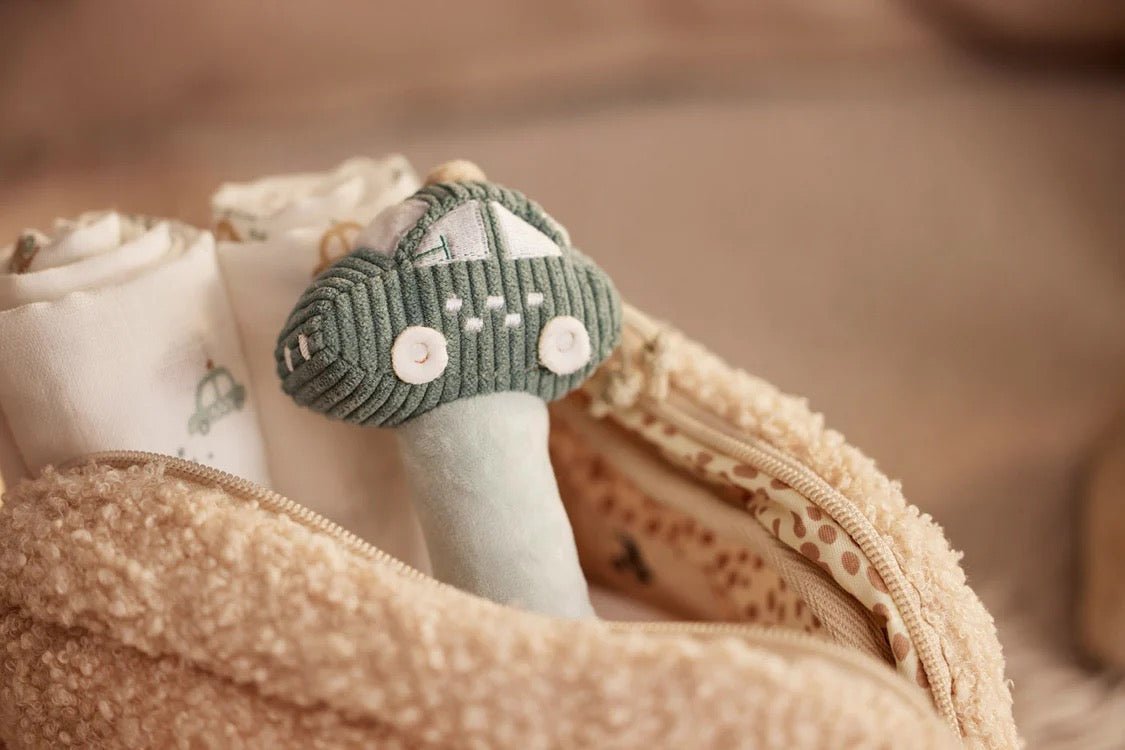 Die On-The-Go Rassel ist ein liebevolles erstes Spielzeug, das Babys spielerisch zum Greifen, Fühlen und Entdecken anregt. Durch die handliche Größe und das weiche Material ist sie überall einsetzbar – im Kinderwagen, unterwegs oder im Kuschelnest.