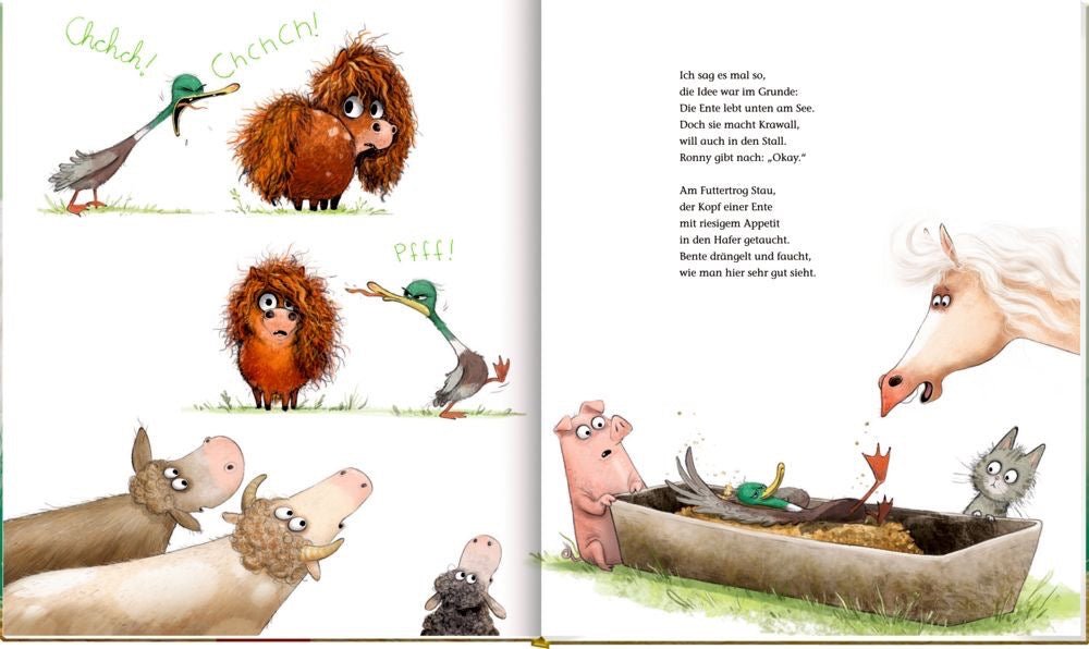 In diesem Bilderbuch erlebt Ronny das Pony gemeinsam mit Gerd dem Pferd und Bente der Ente ein neues Abenteuer rund um Zusammenleben, Rücksichtnahme und Freundschaft. Die gereimte Geschichte eignet sich ideal zum Vorlesen für Kinder ab 3 Jahren und vermittelt wichtige soziale Themen auf leichte, humorvolle Weise.
