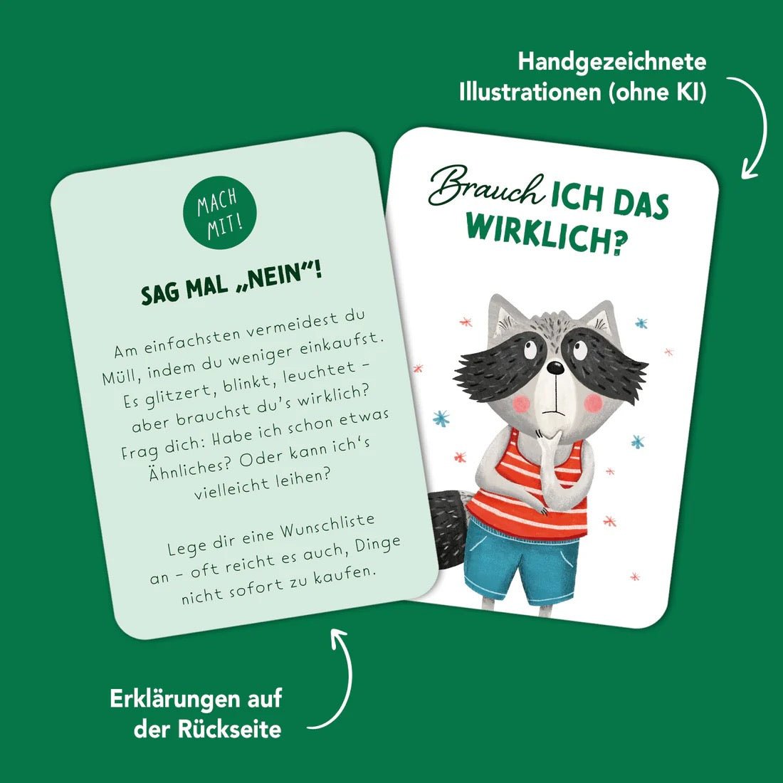 Ob allein, gemeinsam mit der Familie oder in der Schule, diese Karten bringen echte Alltagsthemen kindgerecht auf den Punkt und machen Spaß beim Ausprobieren. So wird Nachhaltigkeit nicht belehrt, sondern erlebt.