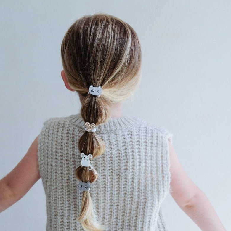 Tierisch süßer Haarschmuck: Die Cat & Mouse Mini Haargummis von Mimi & Lula bringen mit Katzen-, Mäuse- und Herzmotiven verspielten Glanz in Kinderhaare. Im Set sind 8 elastische Gummis (Ø ca. 3 cm) – weich, dehnbar und perfekt für Zöpfe oder Strähnen. Nicht geeignet unter 36 Monaten.