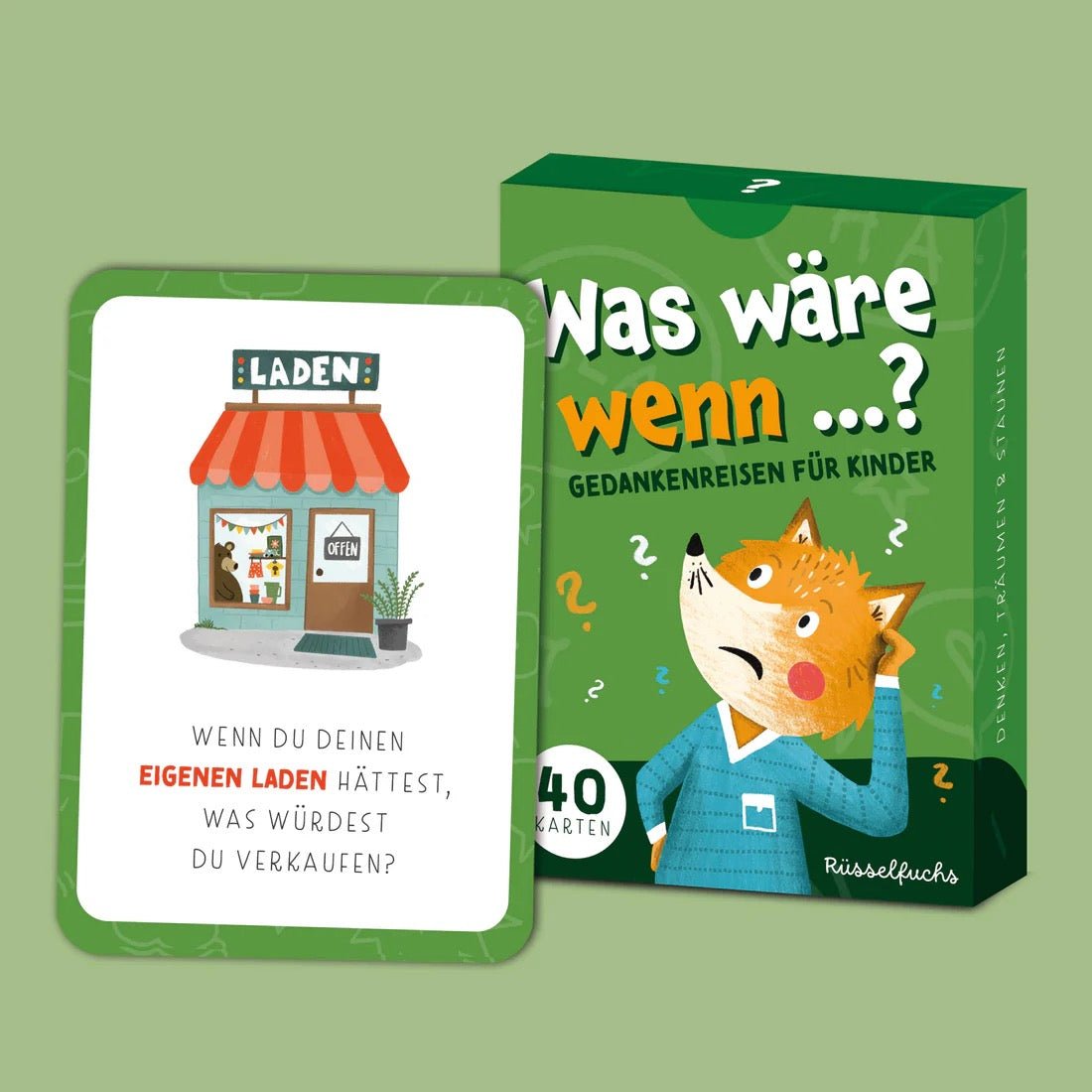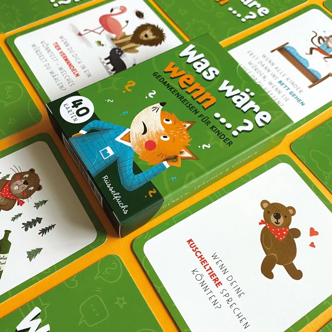 Das liebevoll illustrierte Kartenspiel Was wäre wenn…? von Rüsselfuchs regt Kinder ab 6 Jahren zum Nachdenken, Lachen und Träumen an. 40 fantasievolle Fragen eröffnen spannende Gespräche über Wünsche, Gefühle und Ideen – perfekt für Familien, Schule und Reisen.