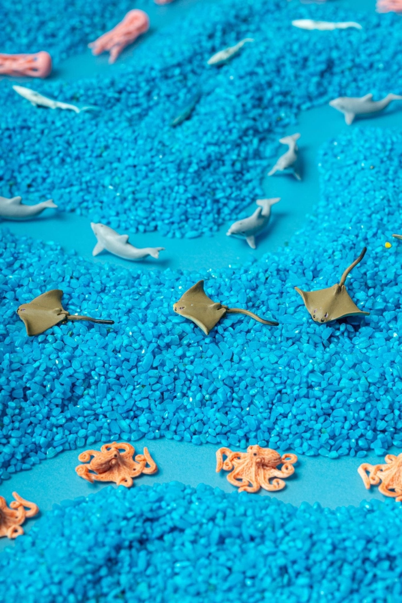 • Sensorikflasche mit Ozean‑Miniwelt: Quallen, Tintenfisch, Delfin, Schildkröte, Hai & Rochen