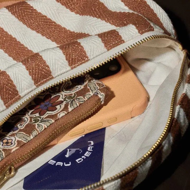 Diese Bauchtasche vereint französischen Stil mit hoher Alltagstauglichkeit. Das gestreifte Rayures Moka-Muster sorgt für einen trendigen Akzent, während das cotton-Material angenehm leicht und robust ist – ideal für unterwegs, Reisen oder als Geschenk.