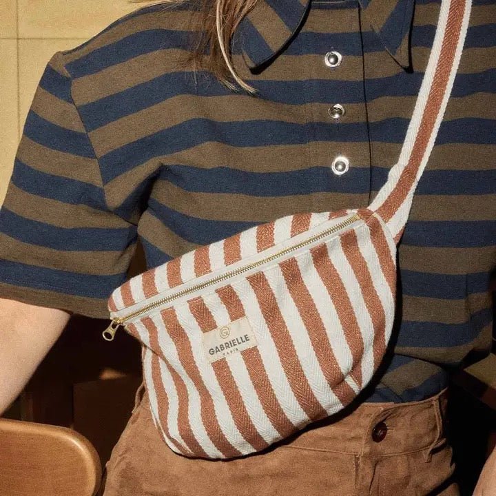 Stylische Gabrielle Paris Bauchtasche im Rayures Moka-Streifenlook aus 100 % Baumwolle mit verstellbarem Gurt und Innenfach. Trage sie klassisch an der Hüfte oder lässig crossbody – ideal für Alltag, Reisen oder als Geschenkidee. Funktion trifft französischen Chic.