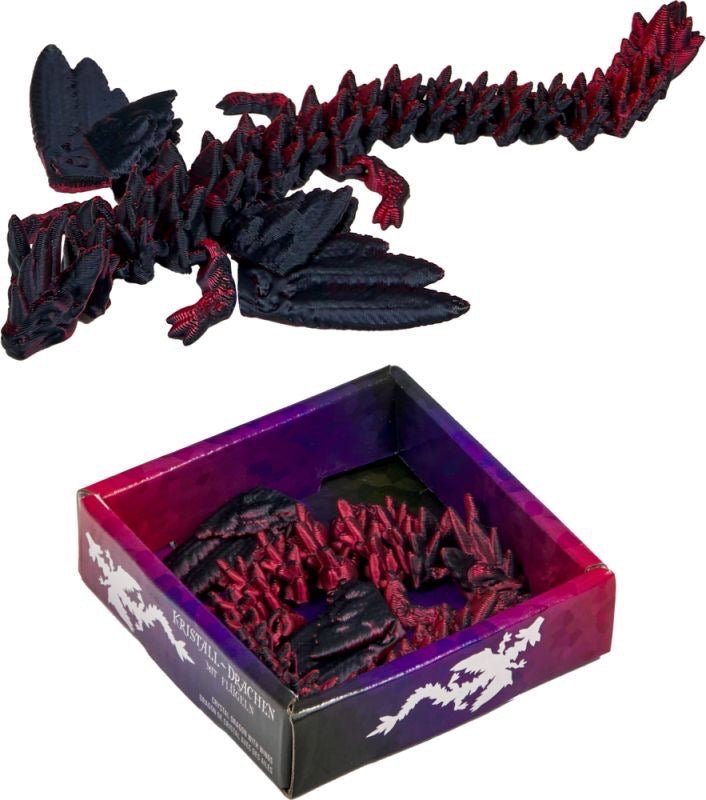 Dieser Kristall Drache vereint Magie und Stil: Sein schwarz-roter Körper fängt das Licht ein und sorgt für faszinierende Effekte im Raum. Die Flügel sind sorgfältig gestaltet, sodass der Drache nicht nur ein Dekostück, sondern ein kleines Kunstwerk ist. Ideal als Dekofigur im Kinderzimmer, Regal oder auf dem Schreibtisch – oder als besonderes Mitbringsel für Drachen- und Fantasy-Fans.
