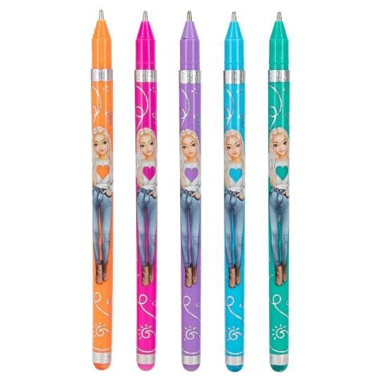 Schreib- und Mal-Spaß mit den Glitter-Stiften von TOPModel in Orange, Pink, Lila, Blau und Grün. Verpackt in einem transparenten Täschchen mit silbernem Holo-Konfetti in der Klappe. Die Minen sind nicht austauschbar.